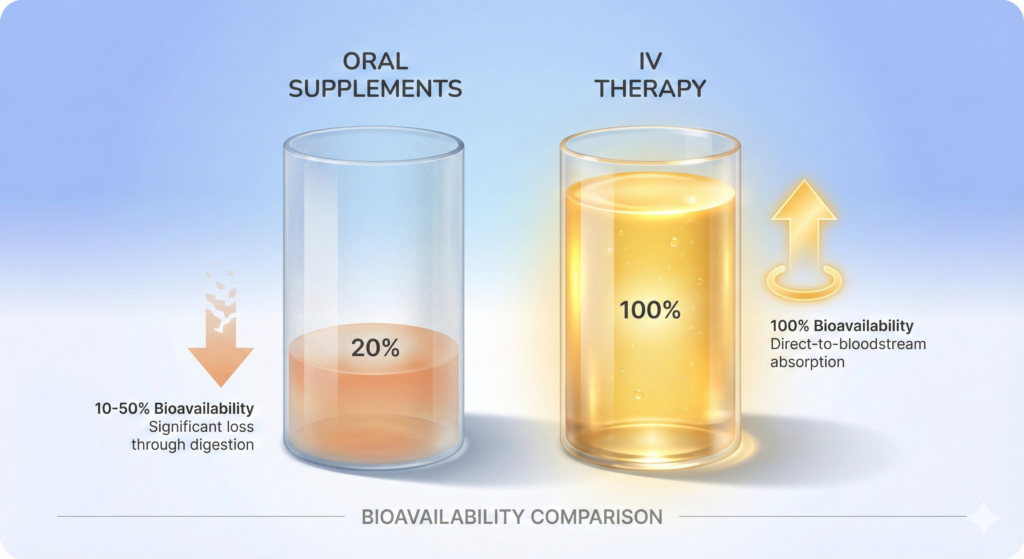 IV therapy delivers close to 100% bioavailability — every milligram reaches your cells immediately.