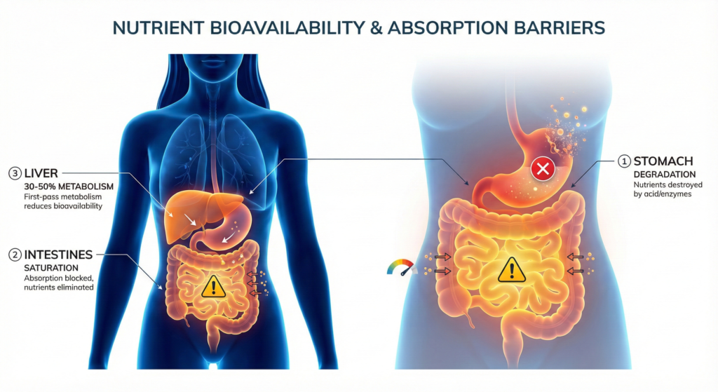 What little survived the gut now gets filtered by your liver, where another 30-50% is metabolized before reaching your cells.