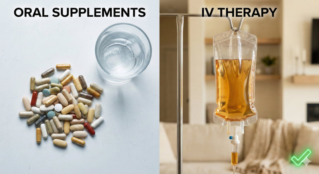 IV therapy ensures nutrients bypass the digestive system entirely, providing 100% bioavailability compared to the 10-50% absorption of oral supplements. If your issue was absorption, IV delivery changes the equation completely.